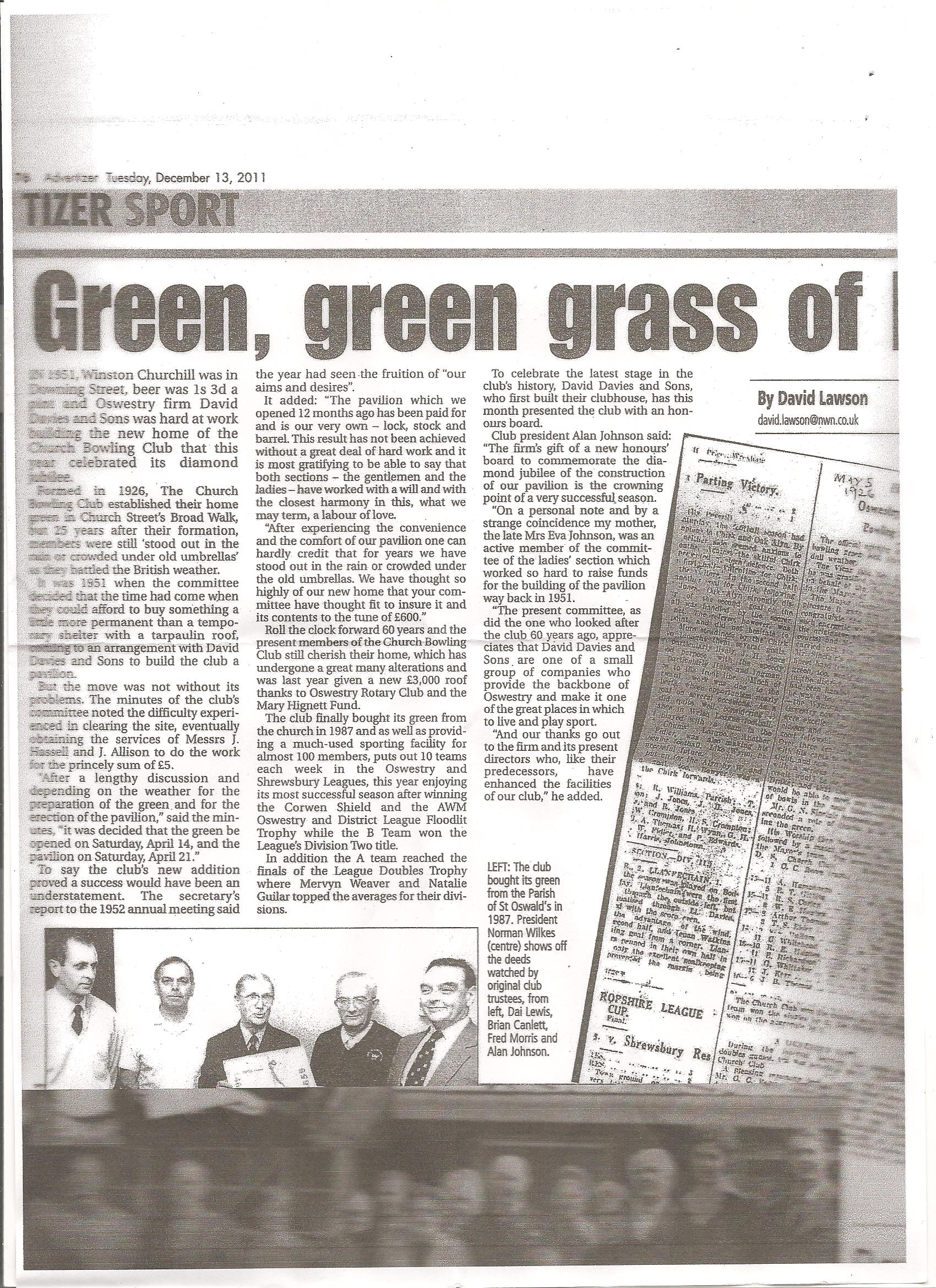 Club President Alan Johnson will present the prizes and he spoke for all the members when he thanked David Davies and Sons for their most generous gift. He said "The firms gift of a new Honour's Board to commemorate the Diamond Jubilee of the construction of our pavilion is the crowning point of a very successful season for the Church Bowling Club." "The present committee, as did the one that looked after the club 60 years ago, appreciates that David Davies and Sons, like the Tizer, are one of a small group of companies who provide the backbone of Oswestry